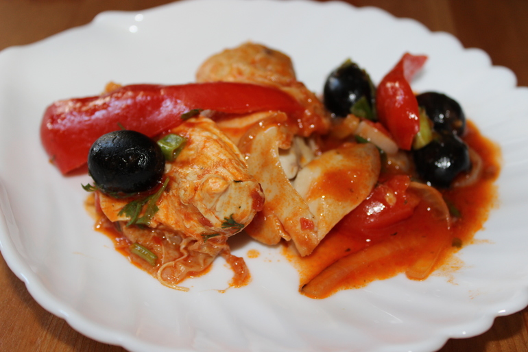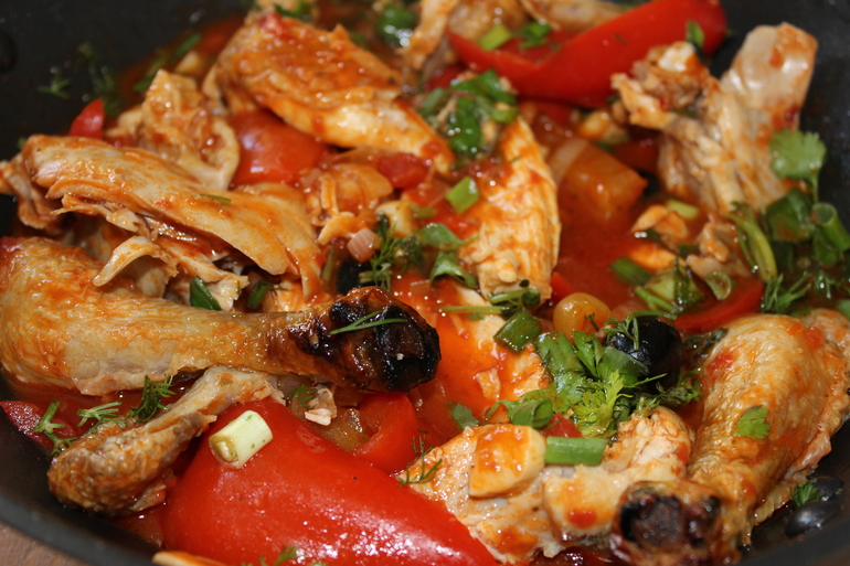 Добавила лучку, еще чеснока, лечо, водички немного, 2 ч.л. без горки крахмала для густоты и в этот соус курицу (у меня уже была запеченная но соли) и маслины. Украсить зеленью)