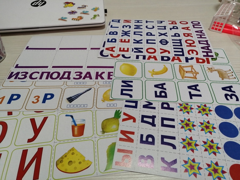 "Обучение грамоте" Тоже обычные картонные карточки с разными заданиями, пока не вникала. Так навскидку - слоги, звуки - согласные-гласные, твердые-мягкие, предложения, предлоги вижу, ударения, ребусы...
