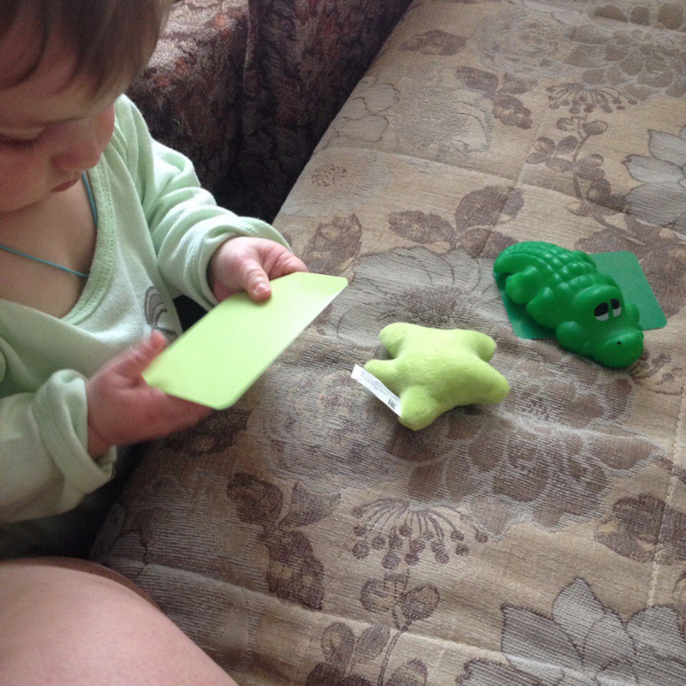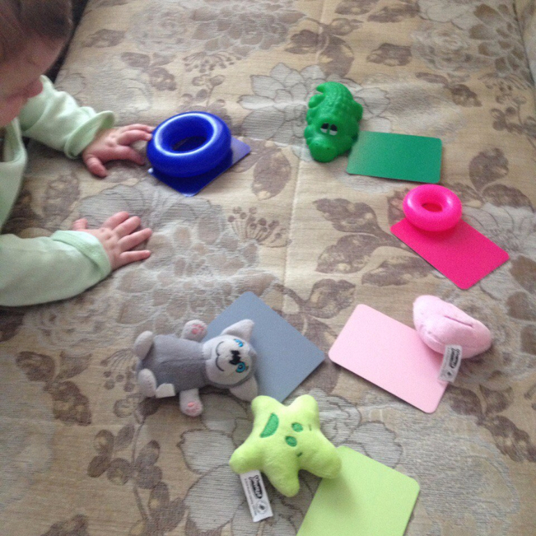 Я уже писала, что мы очень любим цветные карточки из Творчества с пелёнок. Сегодня решили подобрать игрушки в цвет карточек. Я не думала, что из нашей большой коробки погремушек/грызунков/игрушек так тяжело найти однотонные. Это и понятно, детей привлекает все разноцветное. Чем ярче, тем интереснее. А вот карточки подобрать было легко, в наборе 100 оттенков. Так, что для каждой игрушки, нашёлся свой точный оттенок. Так как мой сынишка взрослеет, обычный показ карточек, уже не приносит таких эмоций. Он, конечно, до сих пор с интересом их смотрит, но играть веселее. И, как известно, дети развиваются в игре) Поиграли 5 минут максимум. Я разложила карточки с игрушками, Мирослав брал, то, что ему больше нравится, а я произносила оттенок, отмечая то, что и карточка и игрушка одного оттенка. В следущий раз, я просто показала те же карточки. Меняю форму показа, что бы игры были разнообразными. Такую форму показа я часто встречаю у разных мам, которые занимаются по Умнице. Читаю некоторых, много нереально интересных, крутых идей, как весело и с пользой провести время с малышом)