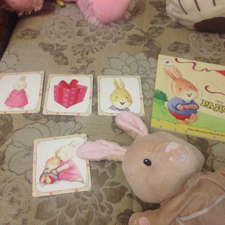 Иметь малыша - это огромная радость) Я стараюсь это показать/рассказать. Помимо интеллектуального развития, я занимаюсь эмоциональным развитием. Как и каждая мама, я обнимаю, целую, говорю какой Мирослав хороший, любимый, умный) Своей мимикой показываю эмоции и озвучиваю их. Если сыночку грустно, я объясняю, что произошло и что он чувствует. Если Мирослав ругается и зол, я и это объясню ему. Но вот совсем забываю рассказывать ему о положительных эмоциях. Ведь, если ребёнок весёлый - это само собой разумеющееся. Однако, эти эмоции тоже объяснить надо) Сегодня из карточек собрали историю, как крольчонок Робби обрадовался, когда мама ему подарила подарок. А игрушка Робби почитал нам книжку, о том, что такое радость. А после крольчонок начал щекотать Мирослава, конечно он начал смеяться , вот в этот момент, я и рассказала, что сейчас Мирослав чувствует радость)