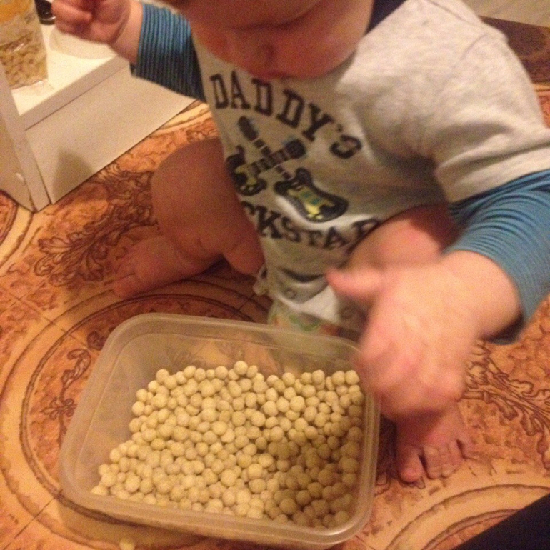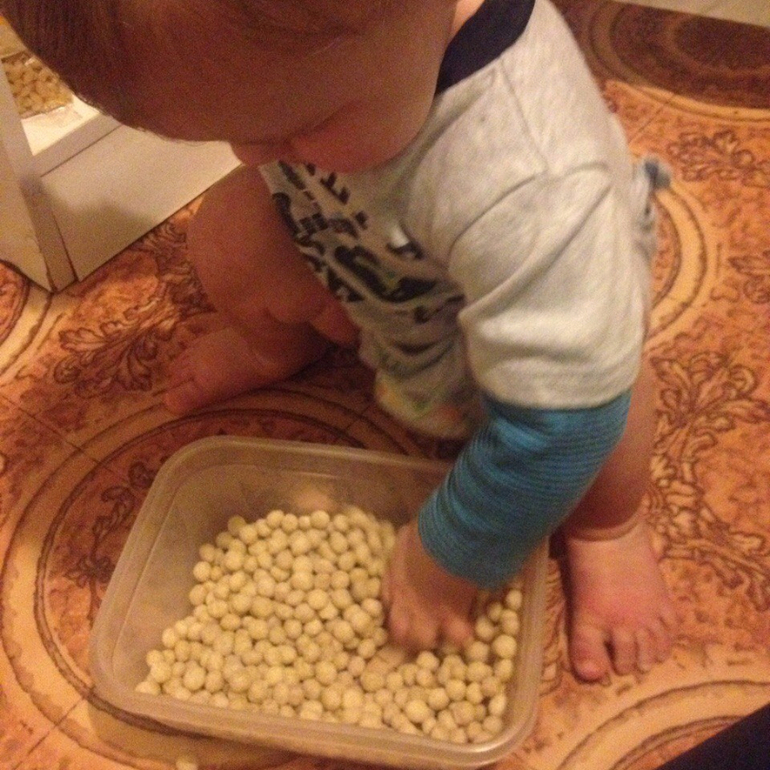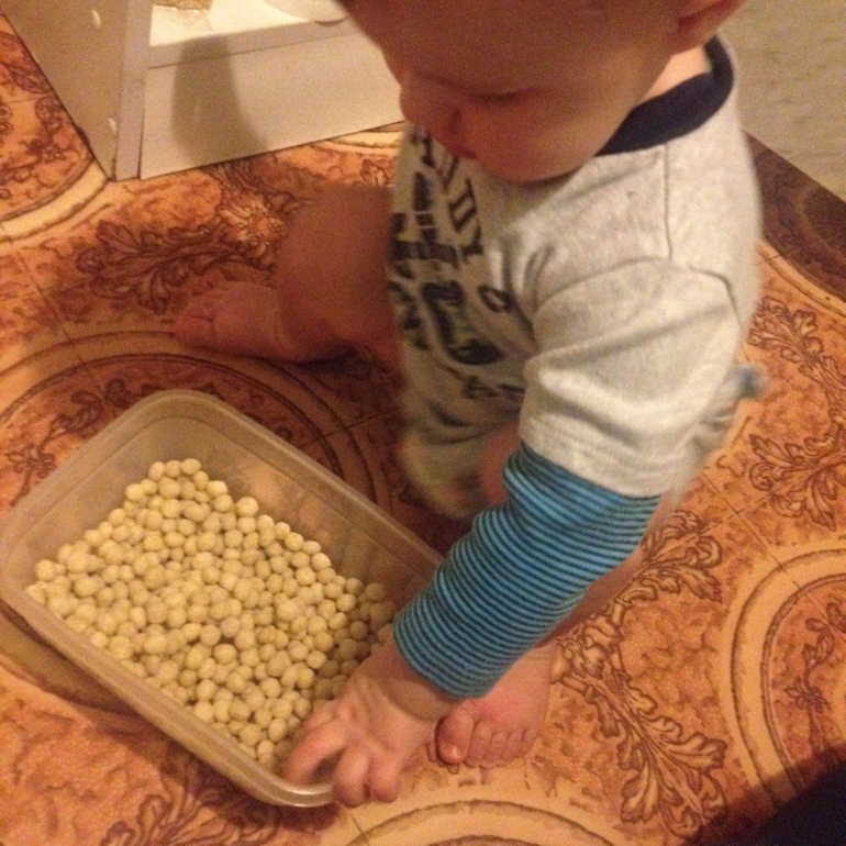 Копались в шариках их сухого, диетического завтрака) мне по вкусу не понравились, но для развития моторики, самое оно) жесткие, шершавые, достаточно крупные (в отличие от гречки, можно успеть вытащить из рта) 3-4 минуты покопались и в рот) да и для первого раза этого достаточно). Мы их покатали, просыпали, потрогали, потёрли в ладошках. Почти съели, главное успеть схватить, они всё же крупные, просто так не проглотишь.