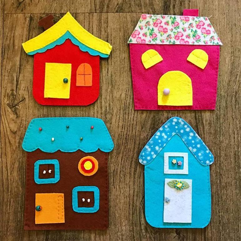 Учим предлоги. Для этого набора я сшила несколько домиков (на фото), окна и двери которых открываются и туда можно прятать разных героев. Плюс сошью еще различные предметы, такие как деревья, бочки, кусты, конуру для собаки, забор и прочее. На ковролинографе таким образом будет маленькая деревня с множество мест, где можно кого-нибудь или что-нибудь прятать. Играем с малышами, разыскивая или наоборот пряча предметы или зверей, а заодно проговариваем множество предлогов - за, под, в, над, под и так далее.