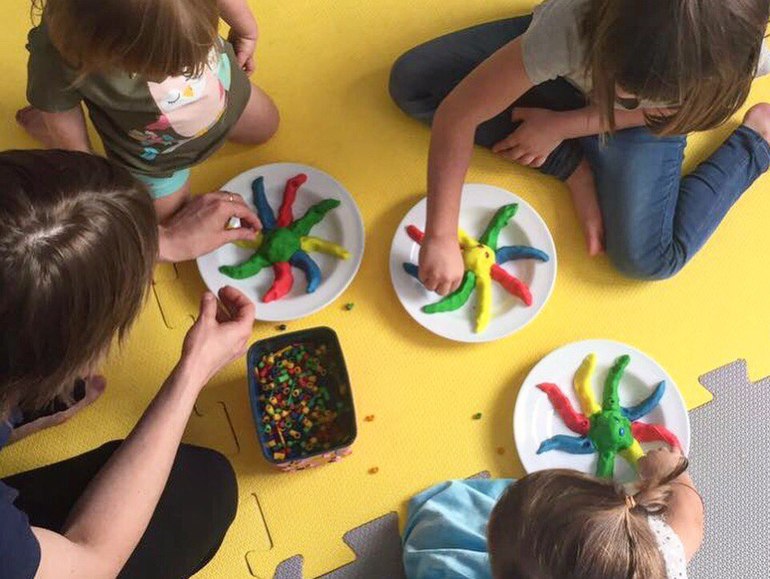 РазвивашкиЕще два занятия позади. С младшей группой играли с новыми сенсорными дощечками, собирали мягкие и твердые шарики в коробку, сортируя по цвету, играли с фетром, закрепляя предлоги, пели, танцевали и украшали смешных осьминогов из пластилина цветными макаронами.
