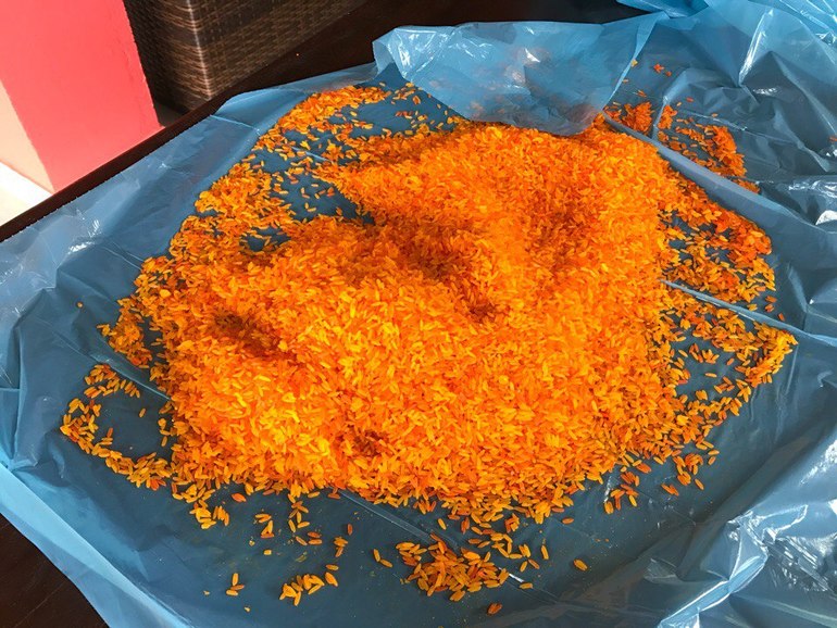 Накрасила сегодня еще риса для занятий. На 8 человек надо много, за раз трудно перекрасить, поэтому я постепенно крашу. То кило желтого, то кило зеленого, так и набрался уже огромный мешок килограмм на 10.