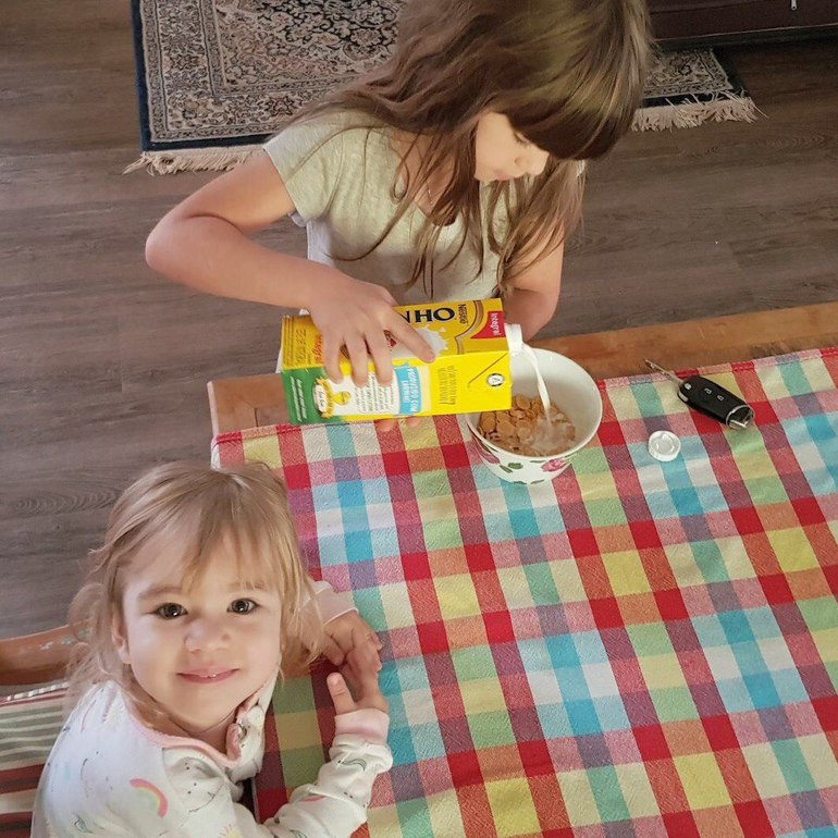 Репост фото, которое запостил с утра муж."Мама еще спит, а дети встали. Застал Валентину за приготовлением хлопьев с молоком для Софии."Идиллия))) пойти еще поспать что ли. Может они и обед сготовят...