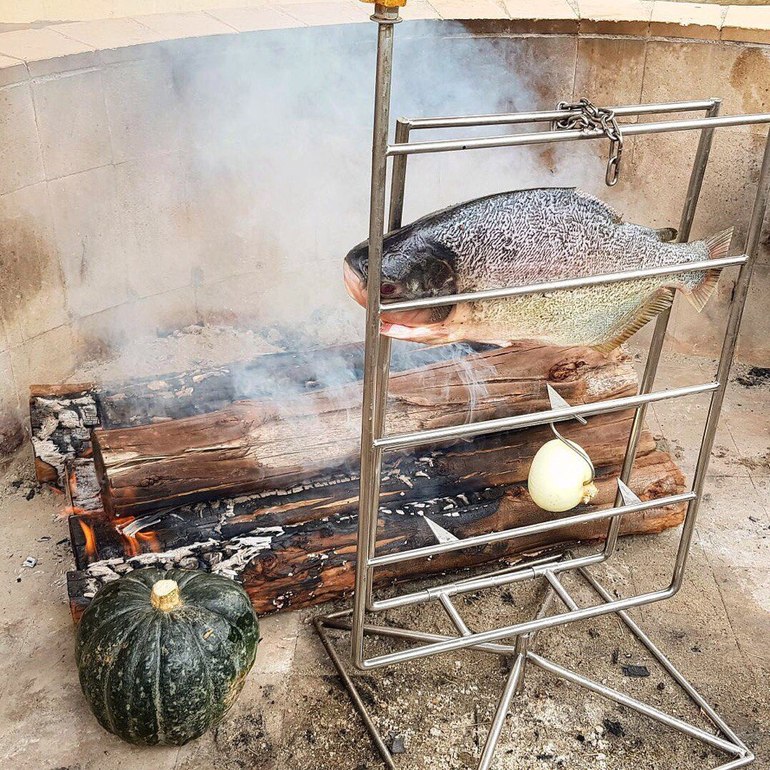 А это наш сегодняшний обед - бразильская рыба паку. Водится в пресноводных водоемах и является родственницей пираньи. Жу, как всегда, удивляет :)