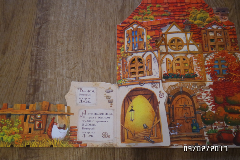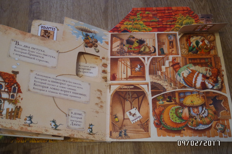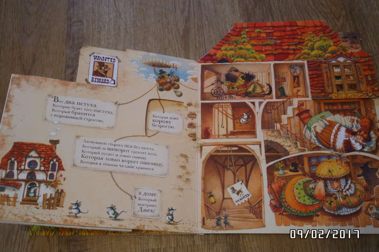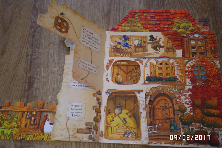 На каждом развороте книги появляется часть стишка и новая иллюстрация.