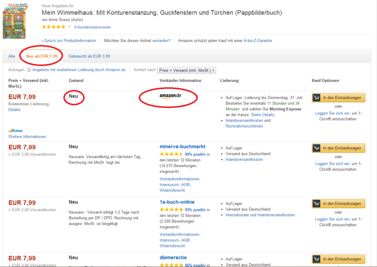 Первая колонка таблицы- цена, вторая-состояние книги, третья-продавец, четвертая-условия доставки. По умолчанию, первый продавец всегда идет амазон, если его нет, то значит этот товар амазоном не поставляется.