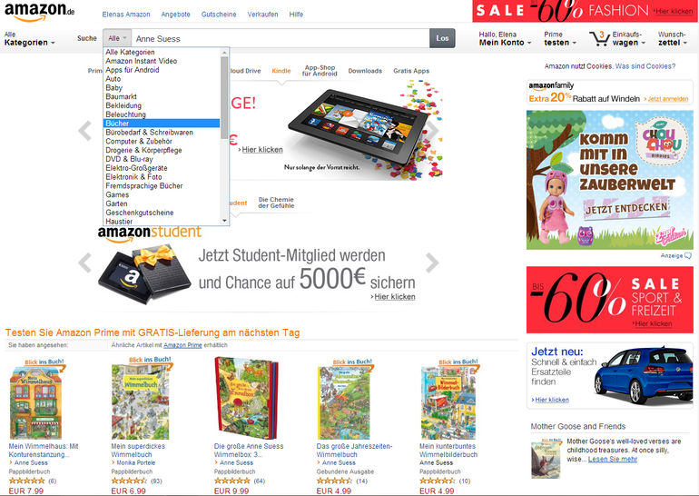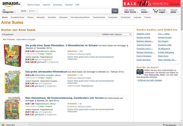 Теперь приступим к поиску нужной нам вещи. Как я уже писала, товаров на амазоне несметное количество, поэтому я не просматриваю все предложения, а сразу вбиваю в поиск ключевое слово, в нашем случае будет художница детских книги Anne Suess, ну и чтобы сузить круг поиска, поставлю категорию книги.
