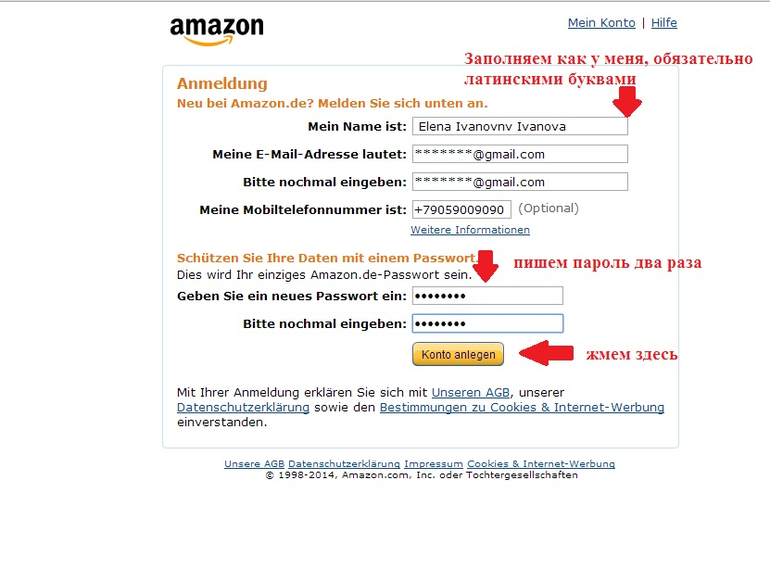 Для начала заходим на страницу амазон.de и регистрируемся, радует то, что ваш аккаунт будет работать на всех площадках амазона, каждый раз регистрироваться не надо, а вот корзина везде будет своя.