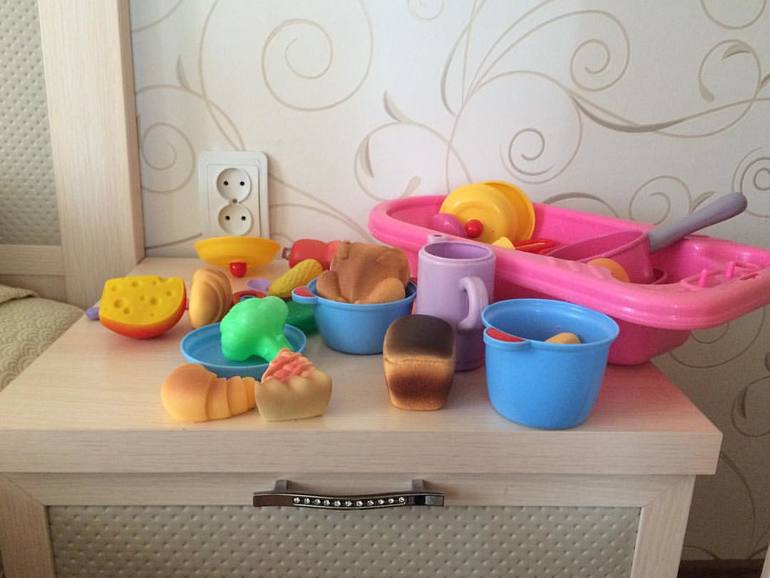 возится со своими "продуктами" и кухней) все раскладывает по кастрюлькам и тарелочкам, даёт нам попробовать и понюхать, хлеб режет, ложки раздаёт