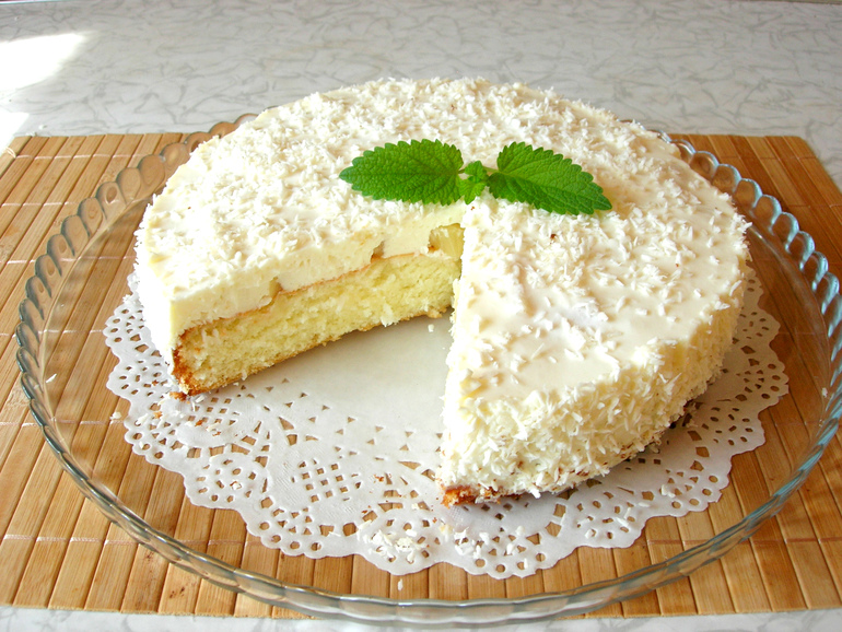 Торт «ПИНА КОЛАДА» - это очень нежный, воздушный десерт на основе вкуснейшего бисквита и нежнейшего суфле. Торт получается очень вкусным, выглядит празднично, а готовится довольно просто.