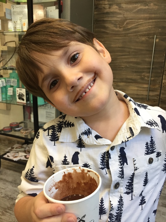 после купания эта чёлочка вниз ложится, на бок. Там стрижка ассиметричная, с одного бока лысинка и все волосы на другую сторону смотрят. Нормально, короче. А вообще, если мы с ним куда-то идем, я ему лаком волосы вверх ставлю. Да, у него свой лак))))