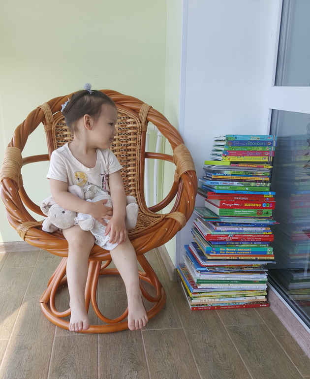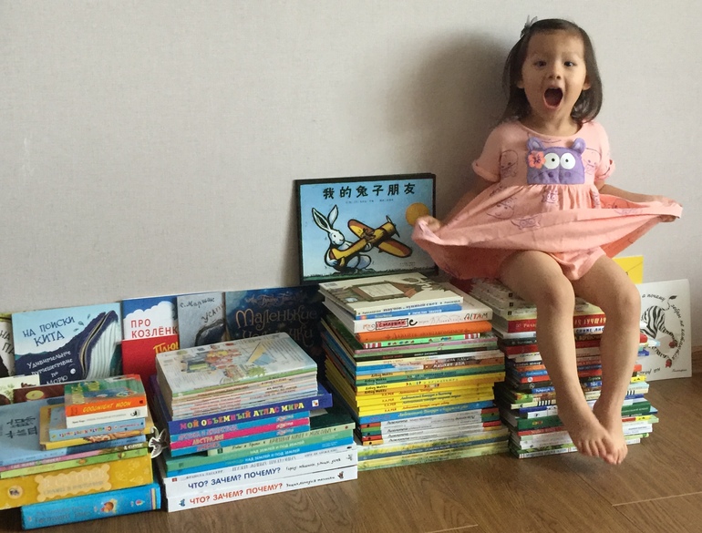 А вот и мой счастливый ребёнок, усердно помогавший собирать книжки со всего дома и сооружать эти необъятные стопочки.