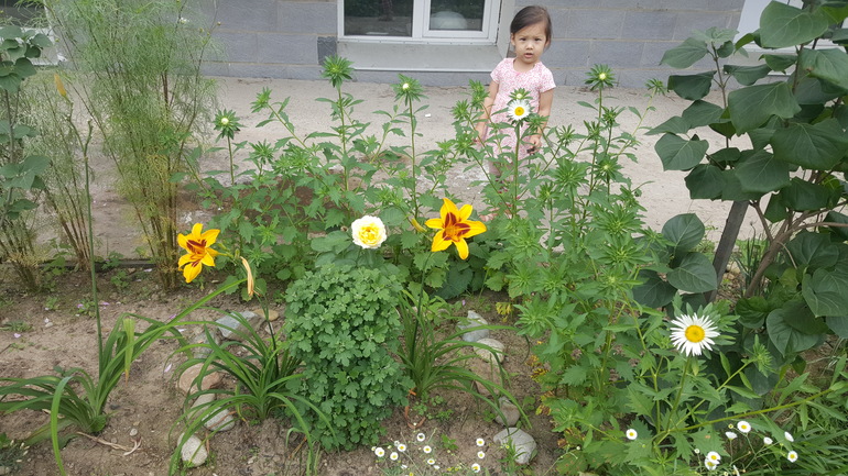 Вместе садили цветы и ухаживали за ними на клумбе возле дома:
