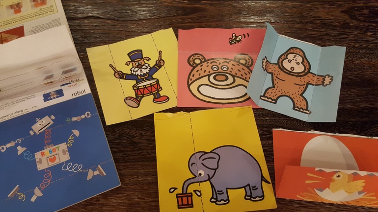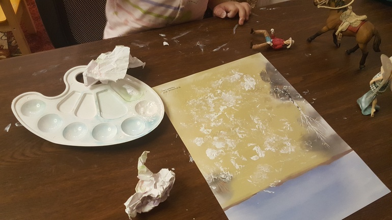 Много лепили из пластилина. Занимались по творческим наборам и тетрадям. "Смешилки-лепилки" - неплохая книжка с заданиями, подразумевающими использование разных материалов, хотя я не очень представляю, на какой (безопасный для ребёнка) клей можно приклеить яичную скорлупу и шерстяные нитки. Ещё один минус - задания с двух сторон, то есть не продумано условие деформации страницы после клея и красок.