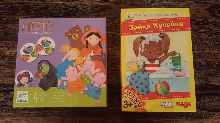 Игры на запоминание и внимательность - "Мемо" от Джеко и "Зайка-купайка" от Хаба. "Мемо" основано на четырех сказках: "Красная шапочка", "Златовласка", "Белоснежка" и "Три поросенка". Игра у нас пошла на ура, все карточки легко раскладывает по табличкам. Пробовали также играть на классическое запоминание, наконец она сообразила, как нужно играть и по какому принципу запоминать карточки.