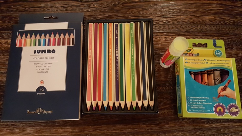 Наша канцелярия : клей, оставляющий цветной след, толстые трёхгранные карандаши не совсем удачные - очень твердые. Особые чувства Кристина испытывает к восковым карандашам Grayola, порисовать ими для неё как высшая награда.