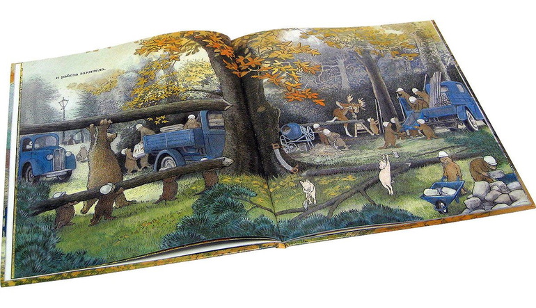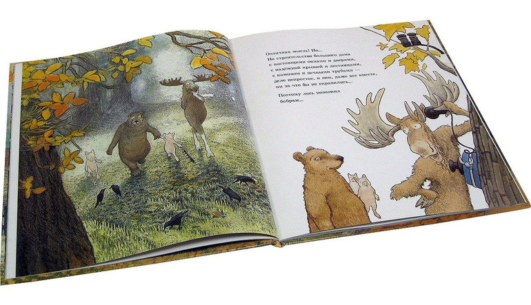 Подкупает и удивительно добрая и не примитивная история о том, как маленькие поросята потеряли жилище, но обрели друзей, в виде медведя и лося, которые помогли им построить с большой бобровой командой новый древесный дом. Сказка, отчасти, напоминает дуэт «Трёх поросят» с «теремком», но это совсем другая история. Эта книга о дружбе, взаимовыручке и сплочённости. Иллюстрации принадлежат кистям Инги Мур - известной во всём мире художницы и автора замечательных искренних и добрых книг.