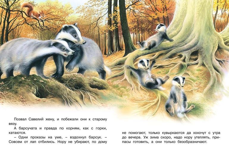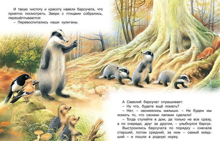 Однажды во время очередного баловства барсучата ненароком сломали вход в нору. Барсук Савелий поспешил за помощью к мудрой сове, которая дала ему действенный рецепт, как научить детей уважать свой труд. В этой истории, наверняка, дети и родители могут увидеть себя со стороны. И, возможно, применить метод воспитания, данный совой, к своим чадам.