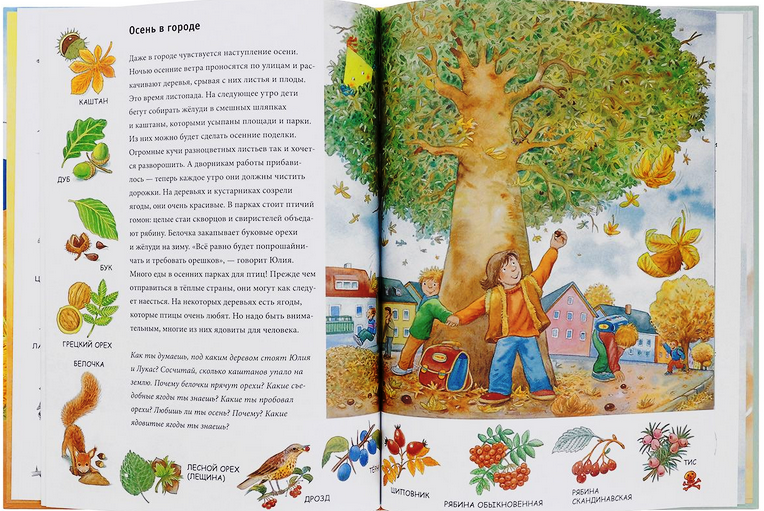 В книге дети найдут ответы на множество осенних вопросов: почему листья меняют цвет, отчего зависит их окраска, почему они опадают, как дышат деревья, почему весенние морозы страшнее зимних и др.