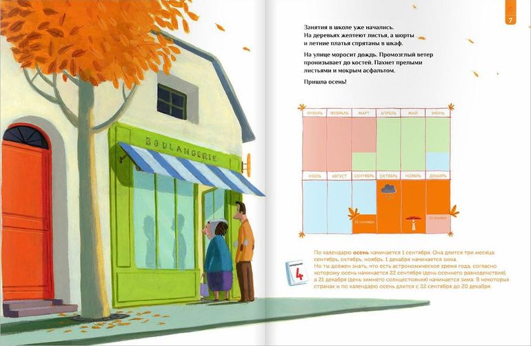 Книга, хоть и не совсем про осень, но в ней есть какая-то сезонная атмосфера: иллюстрации Дарьи Герасимовой в оранжево-багряных тонах, с синими, как дождинки, фрагментами.