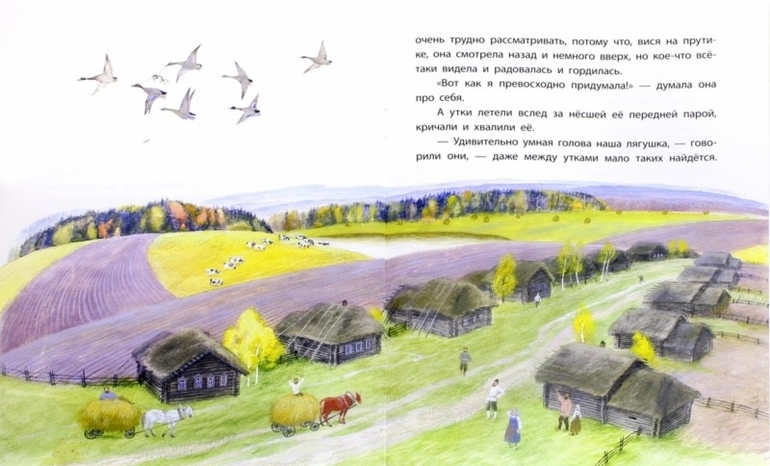 Лучше всех, на мой взгляд, эту историю проиллюстрировал Николай Устинов. Вообще, все книги, содержащие иллюстрации этого художника, невероятно реалистичные, в них отражена вся русская широта души. «Лягушка-путешественница» не стала исключением. К тому же эта книга, как никакая другая, отражает весь колорит нашей осени: птицы улетают на юг, вдали виднеется красно-жёлто-зелёная мозаика леса, а на лужах капли дождя рисуют круги. Вот так листаешь книгу, и уже представляешь шум того самого дождя.