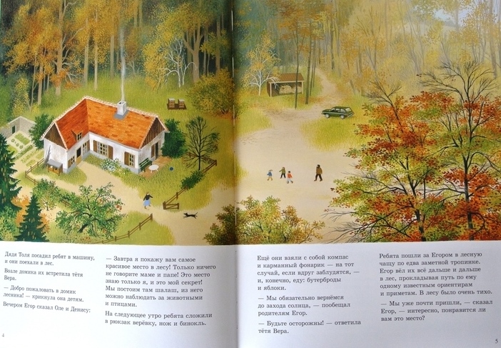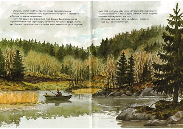 Стоит отметить, что в книге превосходные иллюстрации, отражающие всю осеннюю палитру. Да и описание природы завораживает: «Было слышно, как плещется за бортом вода. Серое озеро, серое небо, темный лес вокруг… Желтые листья уже облетели, природа меняла яркие тона на серо-зелено-коричневые. От влажного воздуха краски казались более резкими и глубокими, и лес как будто светился. Петсон подумал, что это даже красивее, чем яркая зелень летом».