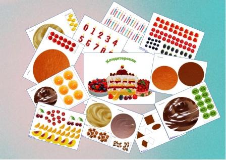 Игра «Кондитерская» имеет несколько вариантов реализации и может быть предложена детям разных возрастов. Заниматься по игре может как один ребёнок, так и несколько детей. В тематический комплект «Барбоскины» я уже включала подобную игру, там мы с Лизой готовили пиццу. Идея не нова, на просторах интернета можно найти массу вариантов настольной игры «Пицца». Я решила не останавливаться и изготовить игру «Кондитерская», в которой ребёнок сможет почувствовать себя кондитером и «приготовить» торт. Игра получилась многофункциональной, охватывающей намного больше дидактических задач, нежели «Пицца».