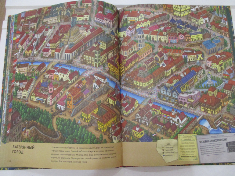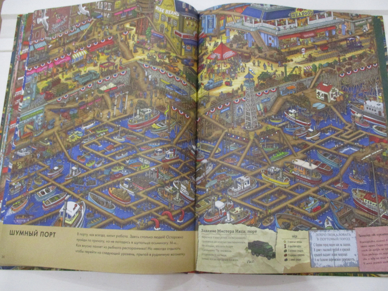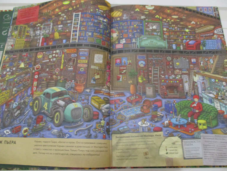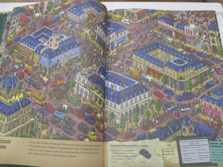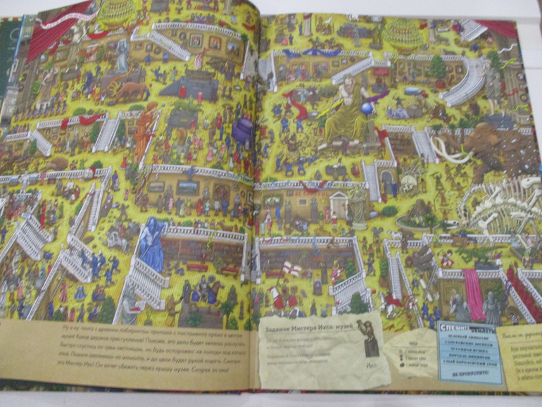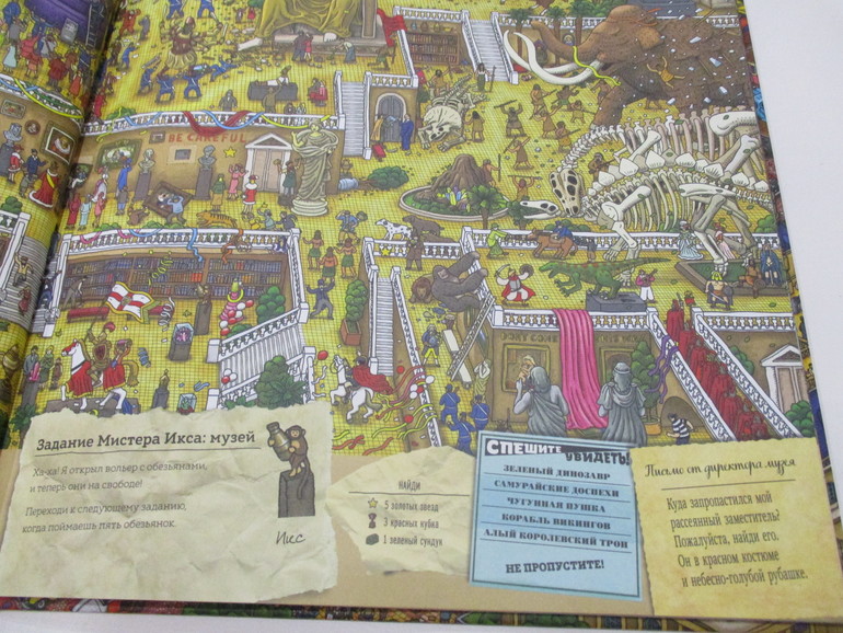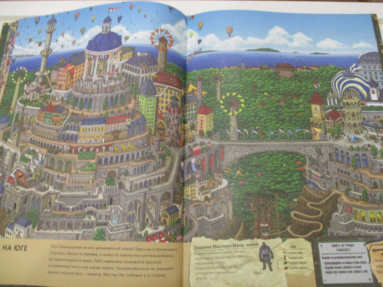 На каждом развороте книги (а их 15 разворотов) спрятан неуловимый Мистер Икс и лабиринт с заданиями. Например, найти кубок, 8 пропавших белых пуделей, 9 самолетов, 7 каменных статуй и т.п. Заданий достаточно много, они учат детей не только внимательности, но и счета, а также навыкам прохождения лабиринтов.