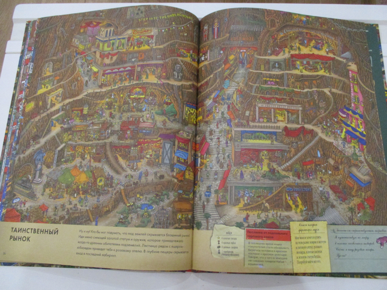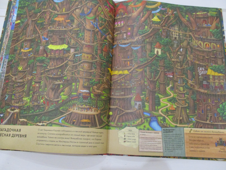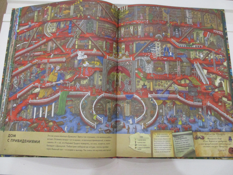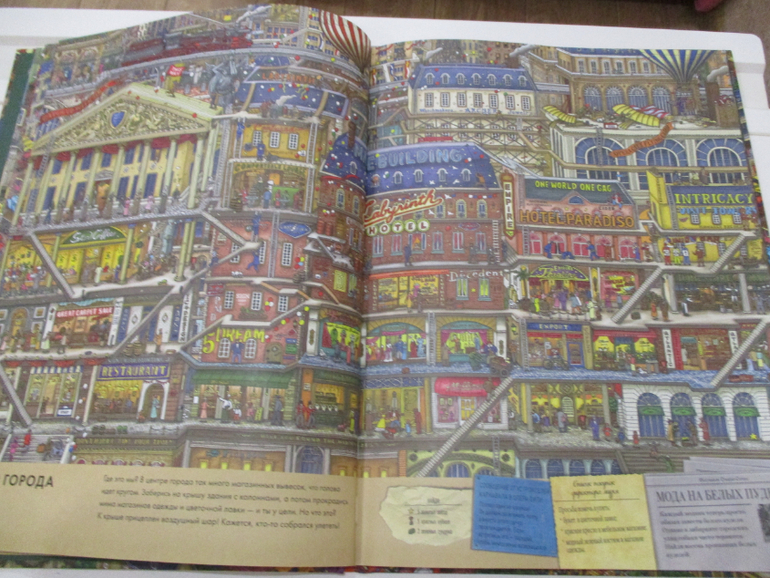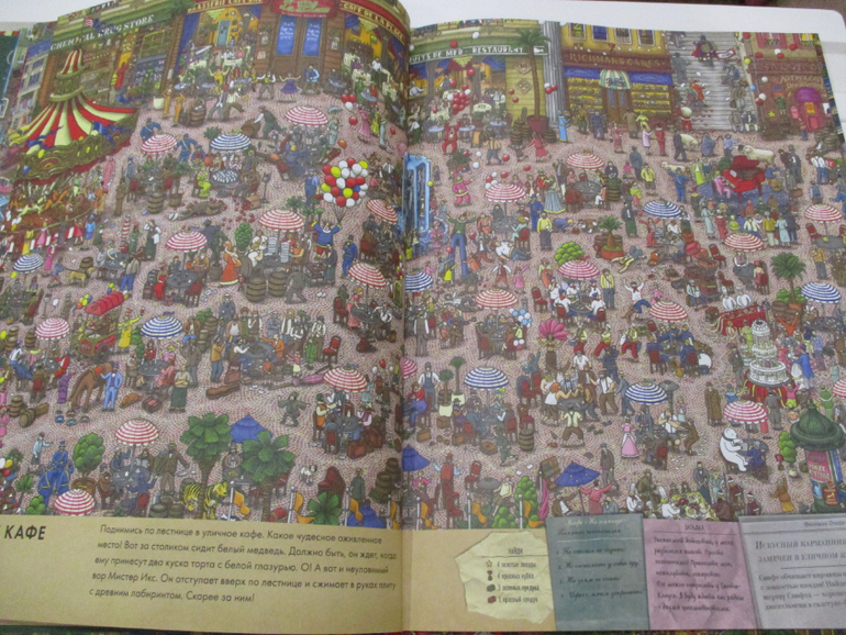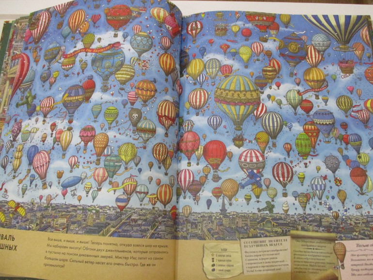 На всех страницах книги очень много деталей, отличная прорисовка зданий, улиц, магазинов и самых мельчайших деталей. Каждый разворот переносит читателя в новый мир. То мы путешествуем по музею, то оказываемся на городском празднике, то попадаем на фестиваль воздушных шаров, или же переносимся в дом с приведениями. Каждая из страниц полна тайн и загадок.