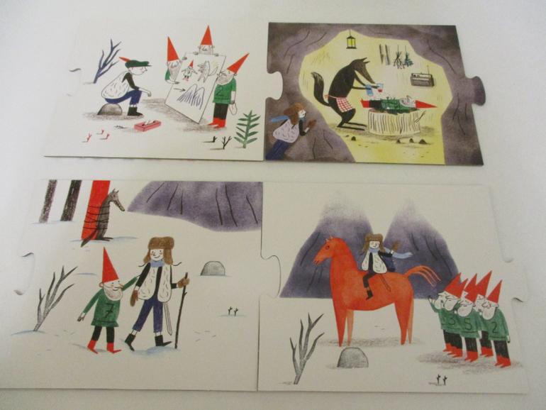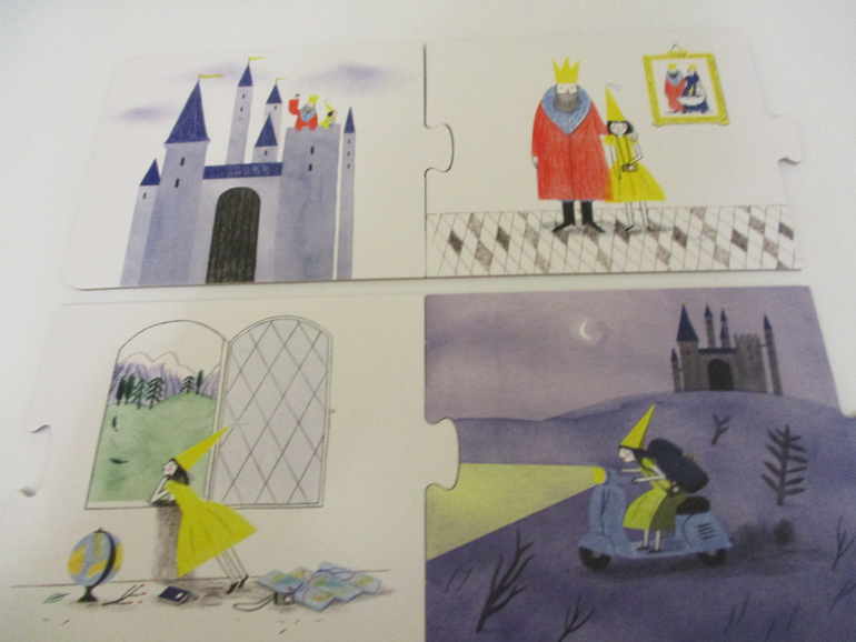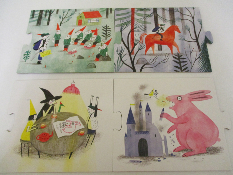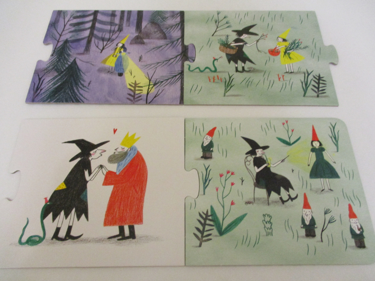 Игра «Однажды в сказке» состоит из 20 двухсторонних карточек-пазлов. Увидев игру, младшая дочка подумала что это пазлы. Но оказалась сказочная игра, основными игроками которой являетесь вы и ваша фантазия. Пазлы достаточно большие, размером с ладонь мужчины и оригинальные. Тут есть и гномы, и волшебница, и принцесса с отцом, и добрый молодец, и огромный розовый заяц, и волшебное дерево.