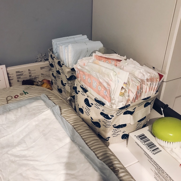 Очень удачно на алиэкспрессе купила два вот таких контейнера на пеленалку. В одном храним одноразовые пеленки, в другом подгузники. А дочка с удовольствием и большим интересом рассматривает нарисованных китов. Качество на "4" - торчали ниточки, и не везде ровный шов, но меня это совершенно не смущает.
