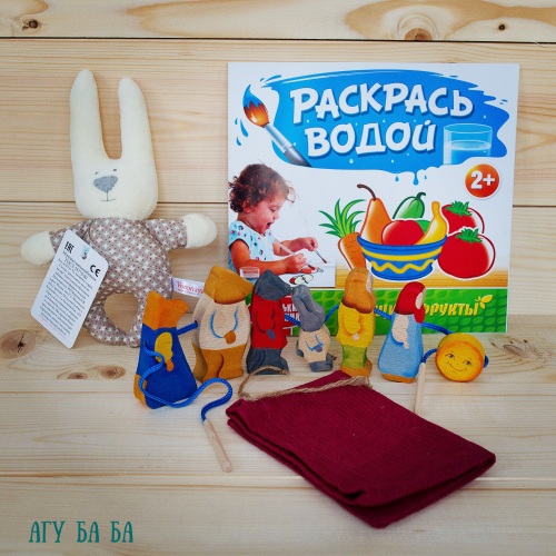 Зайчик ручной работы + Шнуровка с деревянными фигурками Колобок + Раскраска с водой.