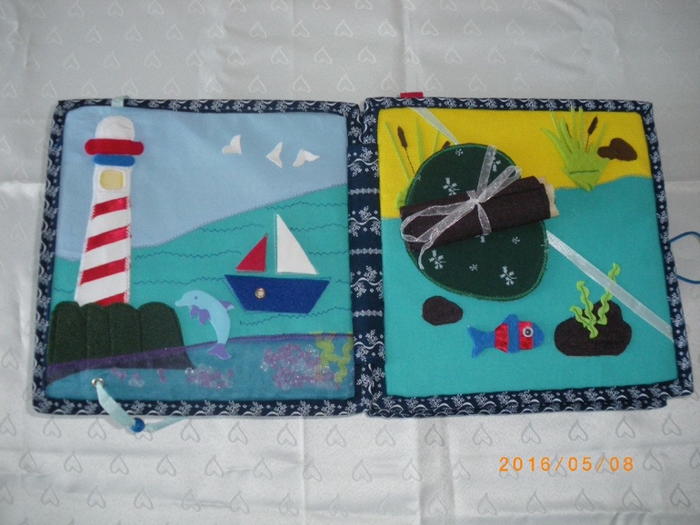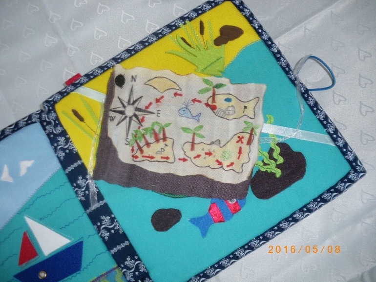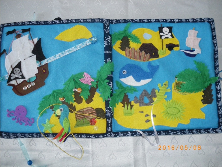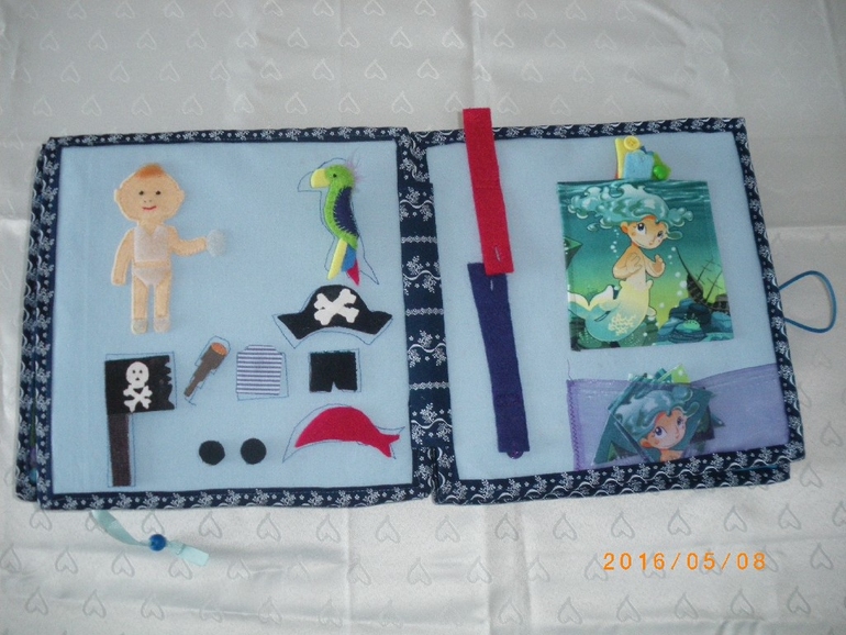 На второй страничке - задание для пирата: собрать цепочку из полосок в цветах радуги. Полоски (они в кармашке) на пуговичках, которые нужно застегнуть.