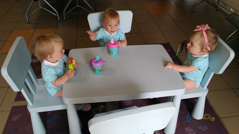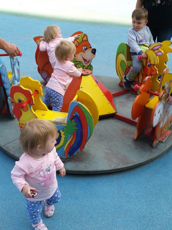 Двух беру за ручки, третья берет за руку сестренку, так и идём),благо всего 20 метров до площадки.
