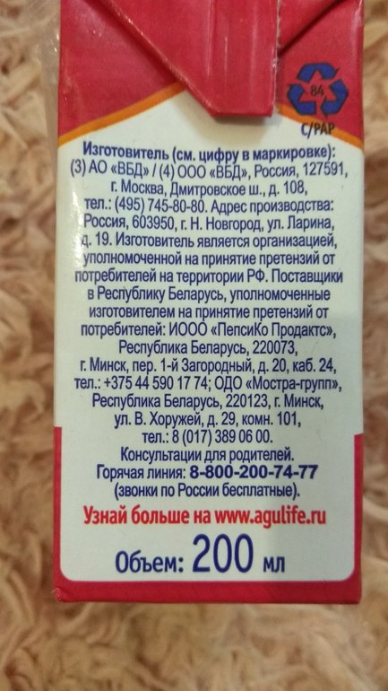 Номинальный объём упаковки 200мл. Тетрапак с трубочкой, детские напитки почти все упакованы точно так же.