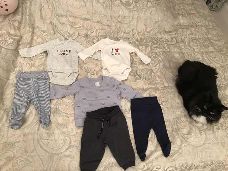ФотопузНаши первые покупочки,заказывала на сайте H&M взяла все 56 размера,без кота никуда у нас,он уже полежал на вещах и обнюхал все,тоже готовится к встрече,любит терется головой об живот))