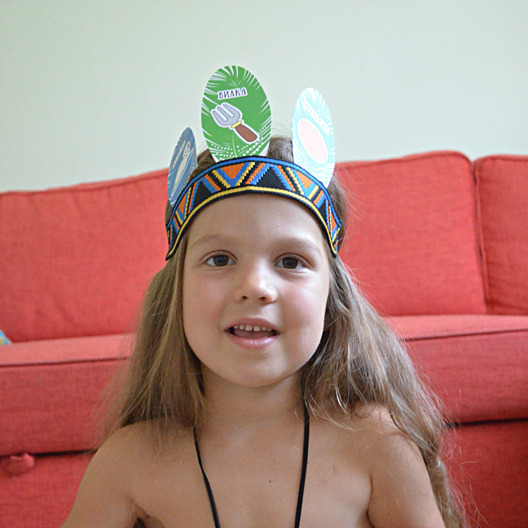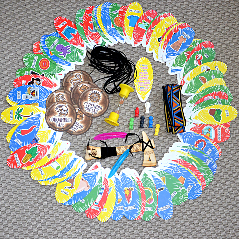 Итак, каждому выдается повязка индейца и амулет с именем, затем все по очереди закрывают глаза, а остальные игроки выбирают перо со словом и вставляют в повязку тому, кто глаза закрыл)