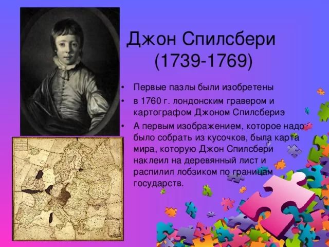А знаете ли вы, что любимые всеми пазлы придумал лондонский картограф Джон Спилсбери. Однажды он решил изготовить оригинальное пособие для изучения географии.