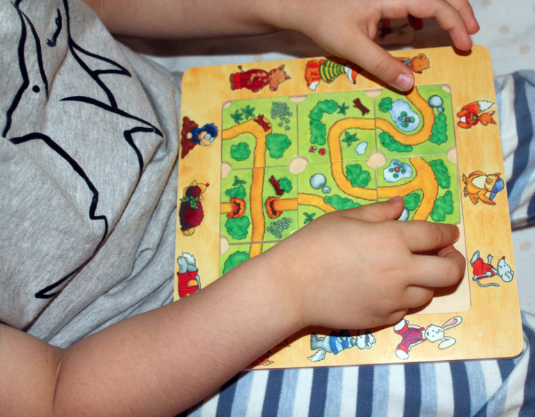А мы отправляемся искать тропинку в лесу). Новая головоломка Goki стала одной из любимых, потеснив на полке Bondibon (у них кстати есть очень похожая логическая игра Колобок-следопыт). Мы с Микаэлом такие настолки очень любим: вот так в игровой форме ребенок решает непростые задачки, тренирует пространственное мышление. Это только с виду всё легко). А на деле, чтобы провести тропинки к двум парам зверьков, придётся поломать голову!