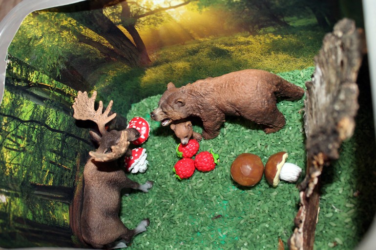 Тут уж мы и про сенсорную лесную коробку вспомнили! Вот чудеса: спрячешь на месяц игрушку от детей, а потом, как достанешь, восторг, как от новой)))