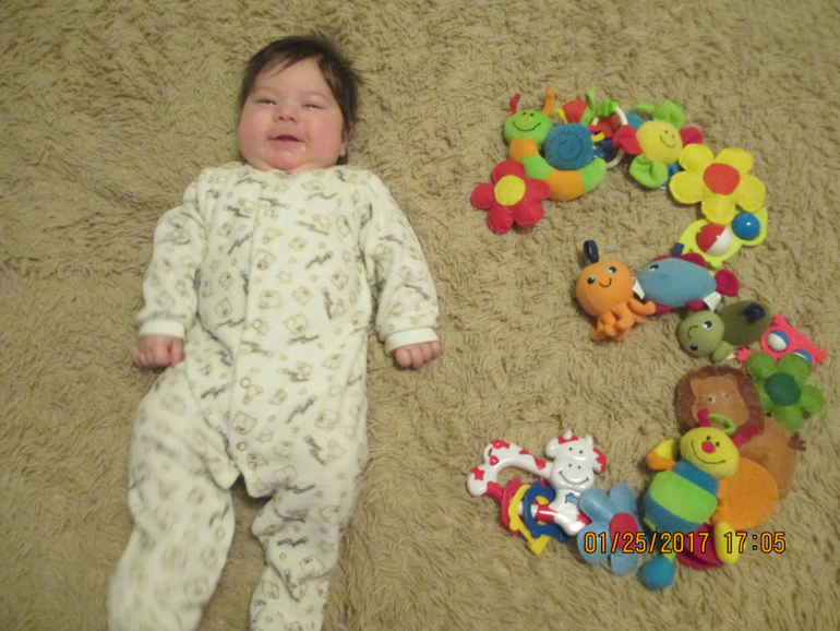 -3,5мес. лежа на животикеухватывает и подтягивает игрухи, поворачивается на бок, иногда на живот или спинку переворачивается, но это скорее случайно