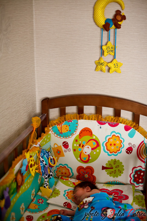 -спит в кроватке, коляске, вибролюльке, иногда стульчике, иногда со мной на кровати