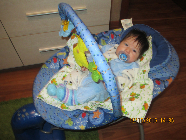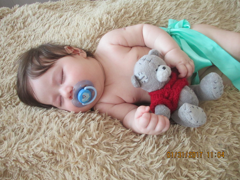 Четвертая неделя: Начал фиксировать взгляд на неск.секунд, следить за игрушкой, лежа на животе ненадолго удерживает головку. Жалобы: срыгивания фонтаном, тремор рук, ног, подбородка, запрокидывание головы, стул со слизью, зеленоватый, водинистый, подозреваю стафилококк. Сдали анализ-конечно он, назначили лечение.
