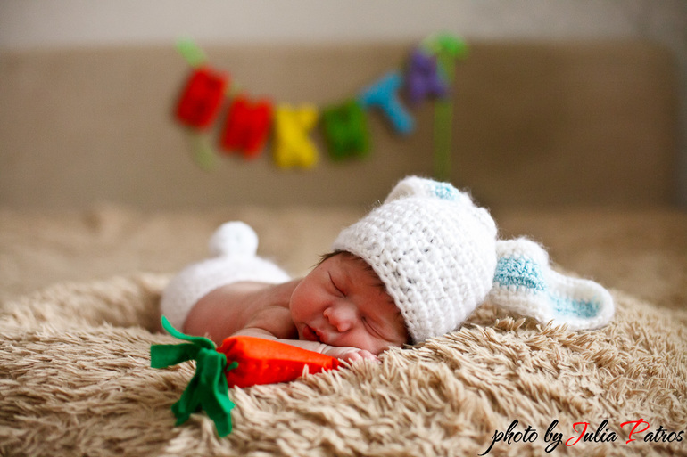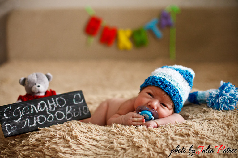 Вторая неделя: Начинаются колики, после кормления обязательно держим столбиком, очень много воздуха выходит. Загноился глазик, припух как синяк, промывали водичкой+капли. Очень много срыгивает. У меня был лактостаз, даже не сразу поняла, что он, т.к. шишек не было в груди...сутки прикладывала лед и была температура невысокая. Готовилась к фотосессии, вязала шапочки.