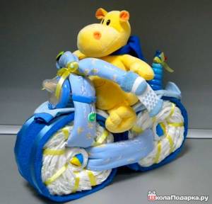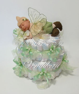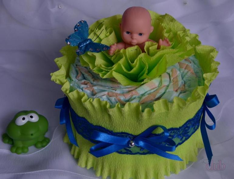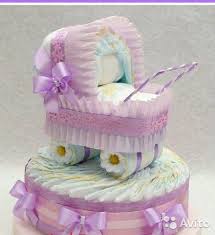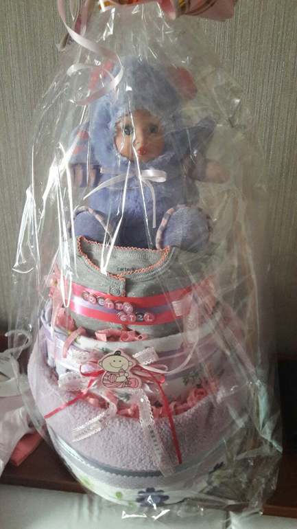 Вот такой торт нам подарили на рождение Веронички.Он состоит из трех ярусов памперсов,детсклго пледа,пеленки,бодика,царапок и куклы.Смотрела в интернете,там очень много комплектаций,на разные возрастные категории и не только в форме торта,млтики,лошадки и т.д.