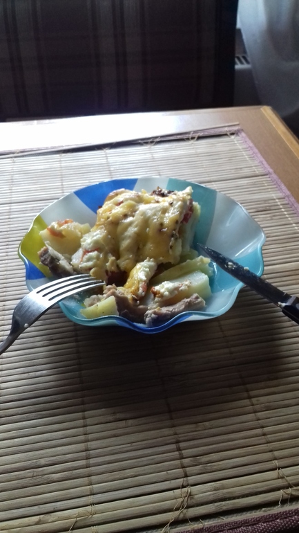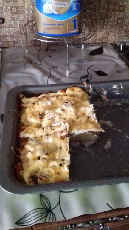 Не знаю,кто как успевает домашними делами заниматься,если детка с рук не слезает,вот у нас это с трудом получается и потому поиходится готовить что-то очень быстрое и" незаморочестое".Семья у нас состоит из четырех человек,двое из которых(мужики,естестно)хотят есть постоянно и вовремя,ага,аки дети малые.И вот вчерась очередная готовка назревала,мясы чуток осталось,денех столько же,а мужики голодные уже по телефону спрашивают че есть сегодня будем.И вот что я приготовила:маломяса порезала мелко,разложила на противень,следом лук репчатый полукольцами,потом картохи сырой кругами резаной,не забываем перчить-солить,нашла помидоры,в праздники недорезали,кругами и поверх картохи,потом все майонезом,кудаж без него,под фольгу и в печь минут на 30,потом,для порядка сыром тертым сверху притрусила.Вот и готова еда.