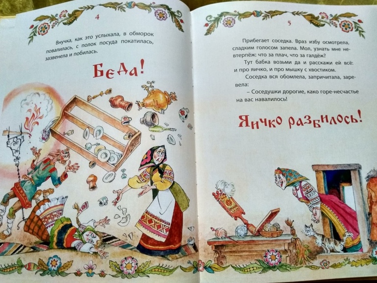 Сказка "Яичко" была куплена давно. История о случайно разбитом яичке, которая есть в большом сборнике Диво-дивное (речь о нем пойдет ниже) обрывается словно на полуслове, а в текстовой и художественной передаче Елисеева обросла множеством подробностей, шуток-прибауток, отсылками к пословицам-поговоркам и другим произведениям русской культуры.