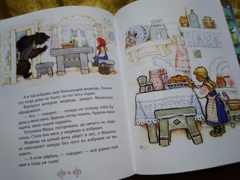 Повторю, что это одна из любимых книг в моей библиотеке на сегодняшний день. По качеству издания - идеальный книжный макет. Люблю иллюстрации, люблю очень оригинальную, собственно-сказительную подачу знакомых сказок с вплетением незнакомых поворотов сюжета. В общем интересен именно авторский колорит, придаваемый сказкам известной сказительницей. И замечательны иллюстрации знаменитых теперь художников.
